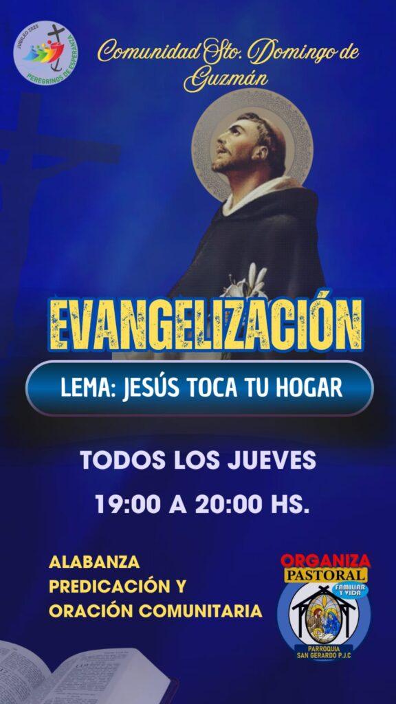 La Pastoral Familiar y Vida de la Parroquia San Gerardo invita a la Evangelización con el Lema: Jesús toca tu Hogar, cada jueves visitando un hogar distinto de la Comunidad Santo Domingo de Guzmán de 19:00 a 20:00 h con Alabanza, Predica y Oración Comunitaria.