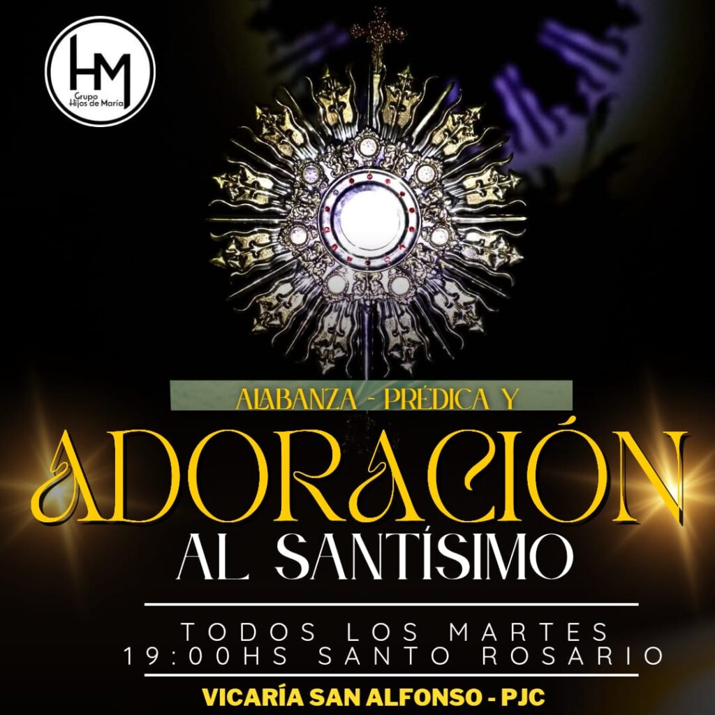 El Grupo Hijos de María invita a toda la comunidad a participar de los encuentros semanales de Adoración al Santísimo Sacramento, un espacio profundo de oración, alabanza y predicación donde nos unimos en fe para adorar la presencia viva de Jesús en la Eucaristía.