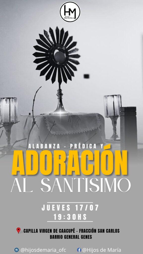 El Grupo Hijos de María invita a toda la comunidad a participar de una noche de profunda intimidad con el Señor, a través de un encuentro de Alabanza, Predicación y Adoración al Santísimo Sacramento del Altar.