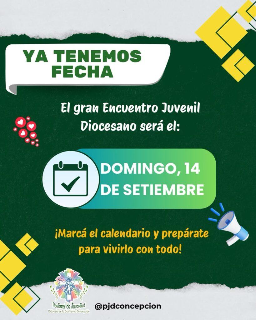 La Pastoral de Juventud de la Diócesis de la Santísima Concepción ha confirmado la fecha oficial del tan esperado Encuentro Juvenil Diocesano. El evento se realizará el domingo 14 de septiembre, una jornada que promete ser un espacio de fe, alegría y comunión entre jóvenes de toda la diócesis.