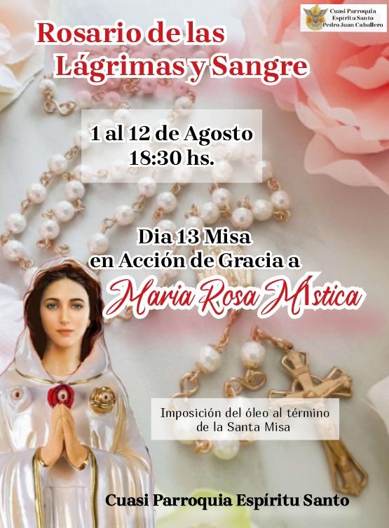 La Cuasi Parroquia Espíritu Santo de Pedro Juan Caballero invita a toda la comunidad a participar con fe y devoción del Rosario de las Lágrimas y Sangre, que se llevará a cabo del 1 al 12 de agosto a las 18:30 horas.Este espacio de oración mariana es una oportunidad para unirse espiritualmente a los dolores y súplicas de la Virgen María, bajo la advocación de María Rosa Mística, símbolo de conversión, oración y reparación por la humanidad.El encuentro culminará el 13 de agosto con la Santa Misa de Acción de Gracias a María Rosa Mística. Al finalizar la Eucaristía, los fieles podrán recibir la imposición del óleo, signo de bendición y consuelo espiritual.Desde la comunidad parroquial se anima a todos los fieles a participar de este itinerario de fe, confiando en la poderosa intercesión de la Madre de Dios, fuente de lágrimas y esperanza para sus hijos.