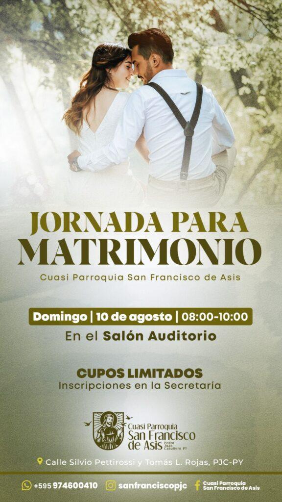 Pedro Juan Caballero, Paraguay – La Cuasi Parroquia San Francisco de Asís anunció la realización de una Jornada para Matrimonio, un espacio especialmente dedicado a fortalecer la vida conyugal desde una mirada cristiana y espiritual. El encuentro se desarrollará el domingo 10 de agosto, de 08:00 a 10:00 horas, en el Salón Auditorio de la comunidad parroquial.