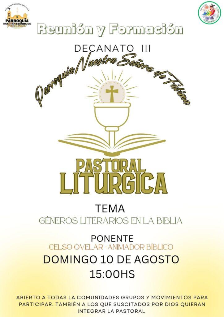 Con el objetivo de fortalecer la vivencia litúrgica y el conocimiento bíblico en sus comunidades, la Pastoral Litúrgica de la Parroquia Nuestra Señora de Fátima, del Decanato III, invita a una jornada de reunión y formación dirigida a agentes pastorales, movimientos y fieles en general.