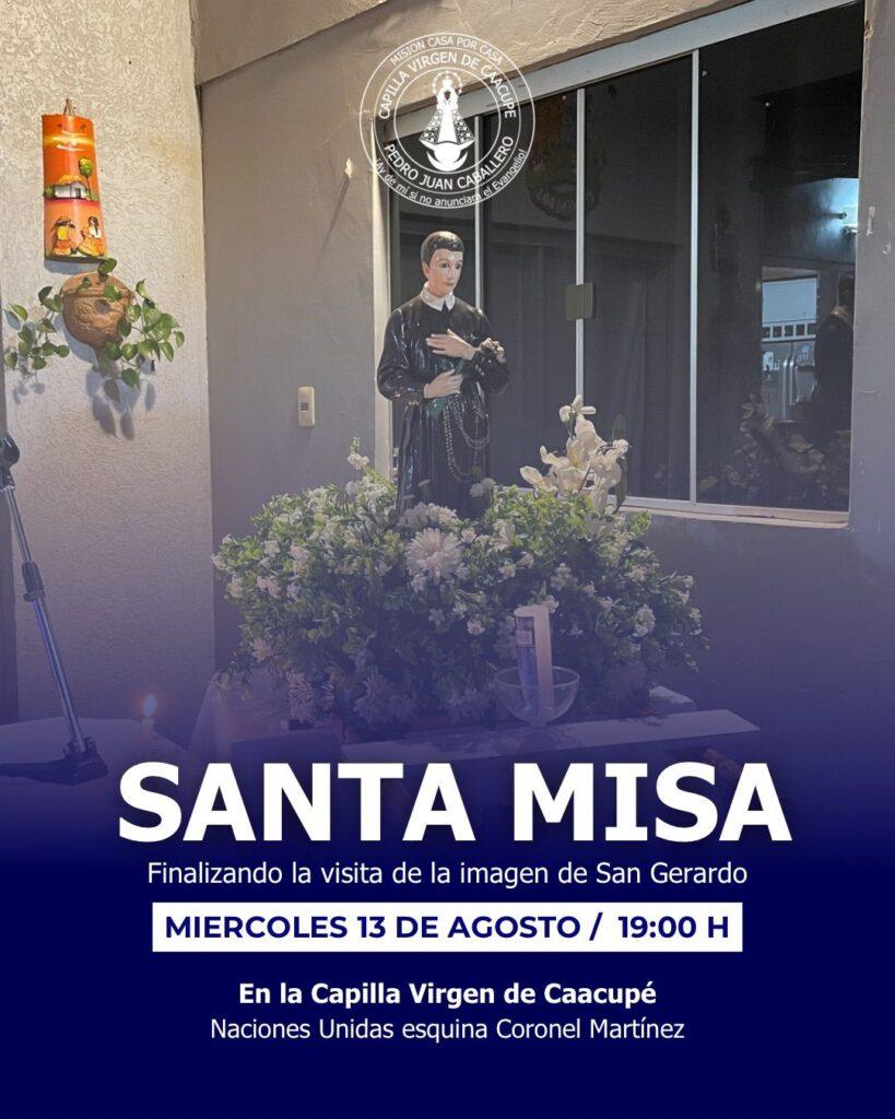 En el marco del recorrido pastoral de la imagen de San Gerardo por todas las comunidades de la Parroquia San Gerardo, en preparación para la Novena en su honor, este miércoles 13 de agosto se celebrará una Santa Misa en la Capilla Virgen de Caacupé.
