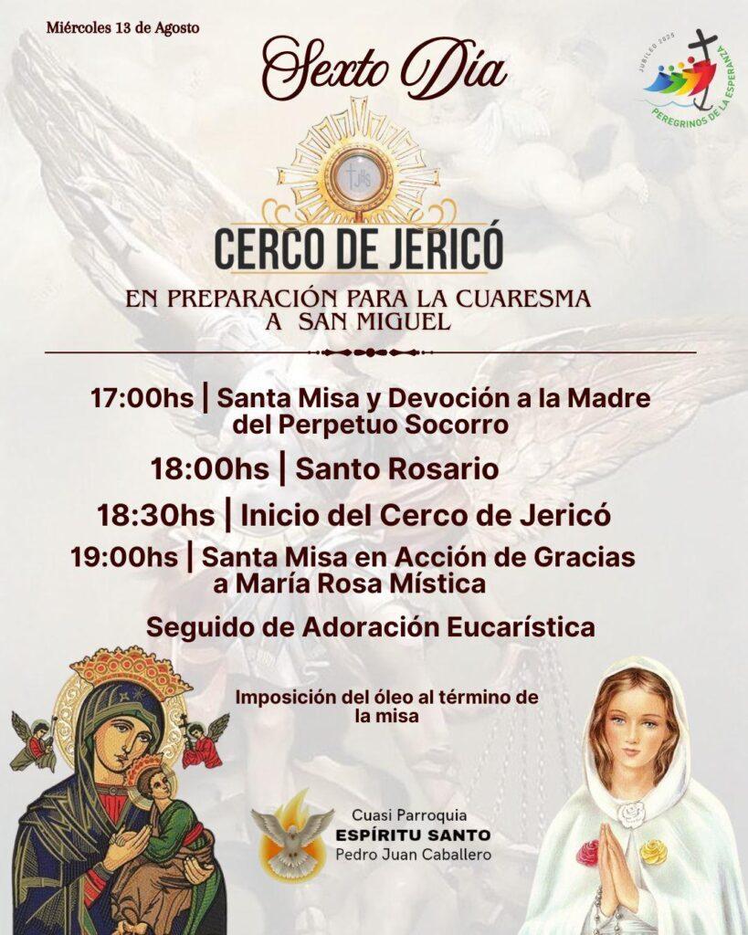 Este miércoles 13 de agosto, la Cuasi Parroquia Espíritu Santo de Pedro Juan Caballero llevará a cabo el sexto día del Cerco de Jericó, en preparación para la Cuaresma y en honor a San Miguel.