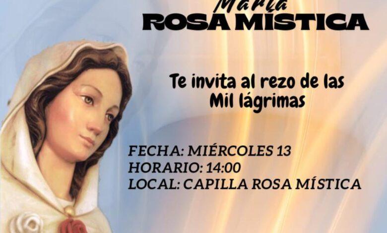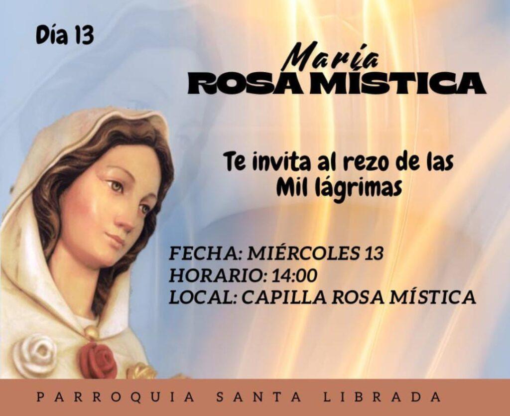 La Parroquia Santa Librada invita a la feligresía a participar del rezo de las Mil Lágrimas en honor a María Rosa Mística. La cita está prevista para el miércoles 13 a las 14:00 horas en la Capilla Rosa Mística.