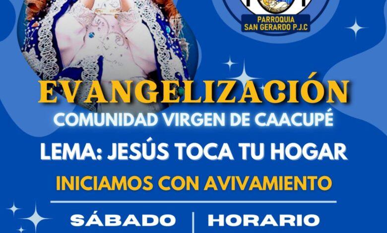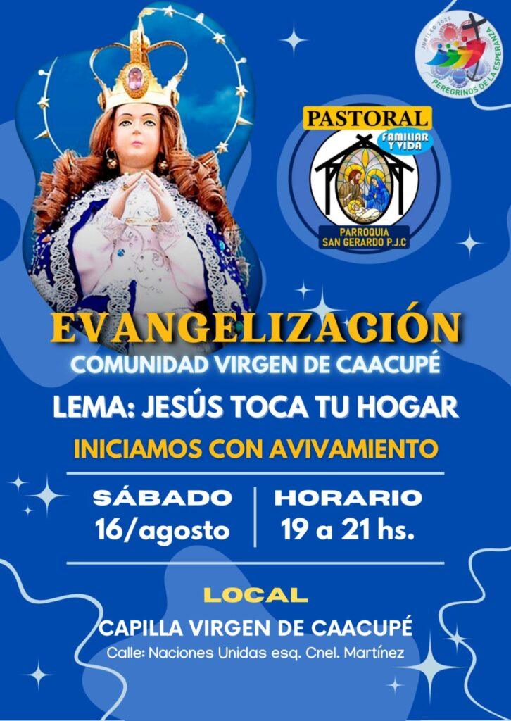 La Comunidad Virgen de Caacupé, perteneciente a la Parroquia San Gerardo, invita a participar de una jornada especial de evangelización bajo el lema “Jesús toca tu hogar”. El encuentro se desarrollará el sábado 16 de agosto, de 19:00 a 21:00 horas, en la Capilla Virgen de Caacupé, ubicada en la intersección de las calles Naciones Unidas y Coronel Martínez.