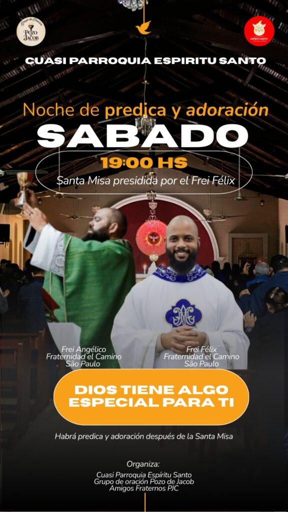La Cuasi Parroquia Espíritu Santo se prepara para vivir una noche especial de fe y encuentro con Dios este sábado. La jornada iniciará con la Santa Misa, que será presidida por el Frei Félix, miembro de la Fraternidad El Camino de São Paulo, Brasil.