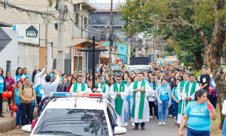 A las 09:30 horas dio inicio la peregrinación hacia la Parroquia Nuestra Señora del Perpetuo Socorro, templo jubilar del Decanato III, designado como tal por monseñor Miguel Ángel Cabello, cuando era obispo de la Diócesis de la Santísima Concepción y actualmente pastor de la Diócesis de Villarrica del Espíritu Santo. Durante el recorrido, los catequistas rezaron el Santo Rosario, acompañados de cantos, pancartas y globos de colores que identificaban a cada comunidad. Los Misterios Gloriosos fueron distribuidos por parroquias, vividos con gran devoción en cada estación.