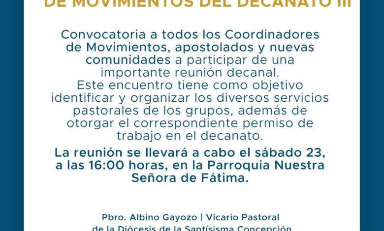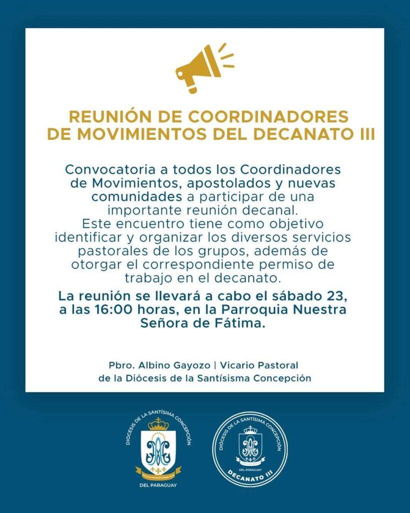 La Diócesis de la Santísima Concepción, a través del Vicario Pastoral Pbro. Albino Gayoso, convoca cordialmente a todos los coordinadores de movimientos, apostolados y nuevas comunidades a participar de la próxima Reunión Decanal, que se llevará a cabo el sábado 23 de agosto, a las 16:00 horas, en la Parroquia Nuestra Señora de Fátima.