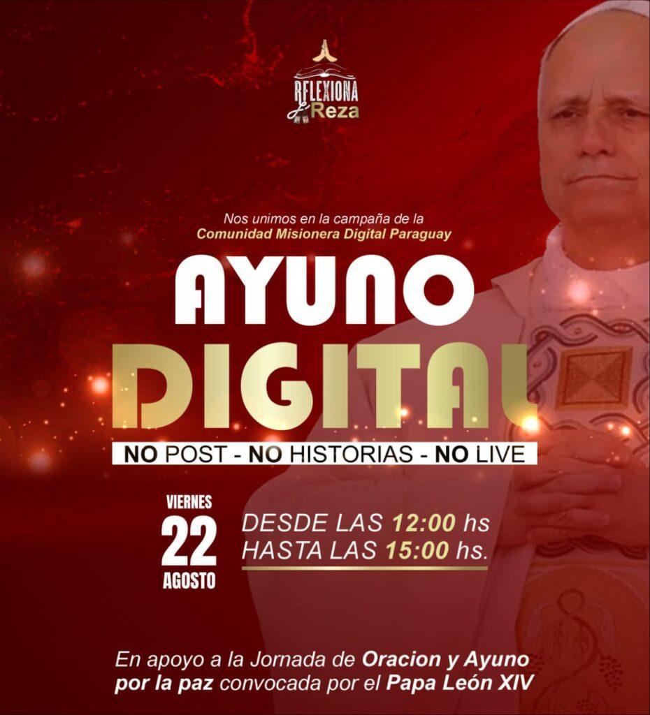 Desde Reflexiona y Reza, nos sumamos con compromiso y fe a la campaña de Ayuno Digital promovida por la Comunidad Misionera Digital del Paraguay. Este viernes 22 de agosto, entre las 12:00 y las 15:00 horas, haremos silencio en nuestras redes: sin publicaciones, sin historias, sin transmisiones en vivo. Un gesto simbólico pero poderoso que busca abrir espacio a la oración y la reflexión profunda.