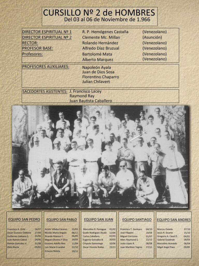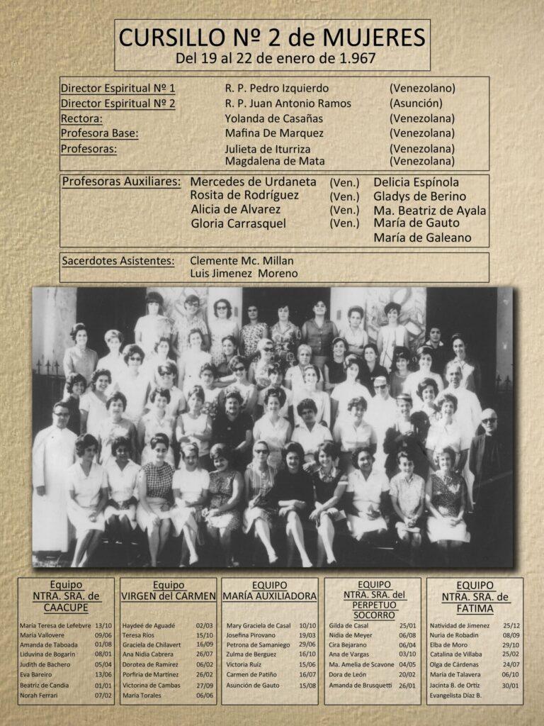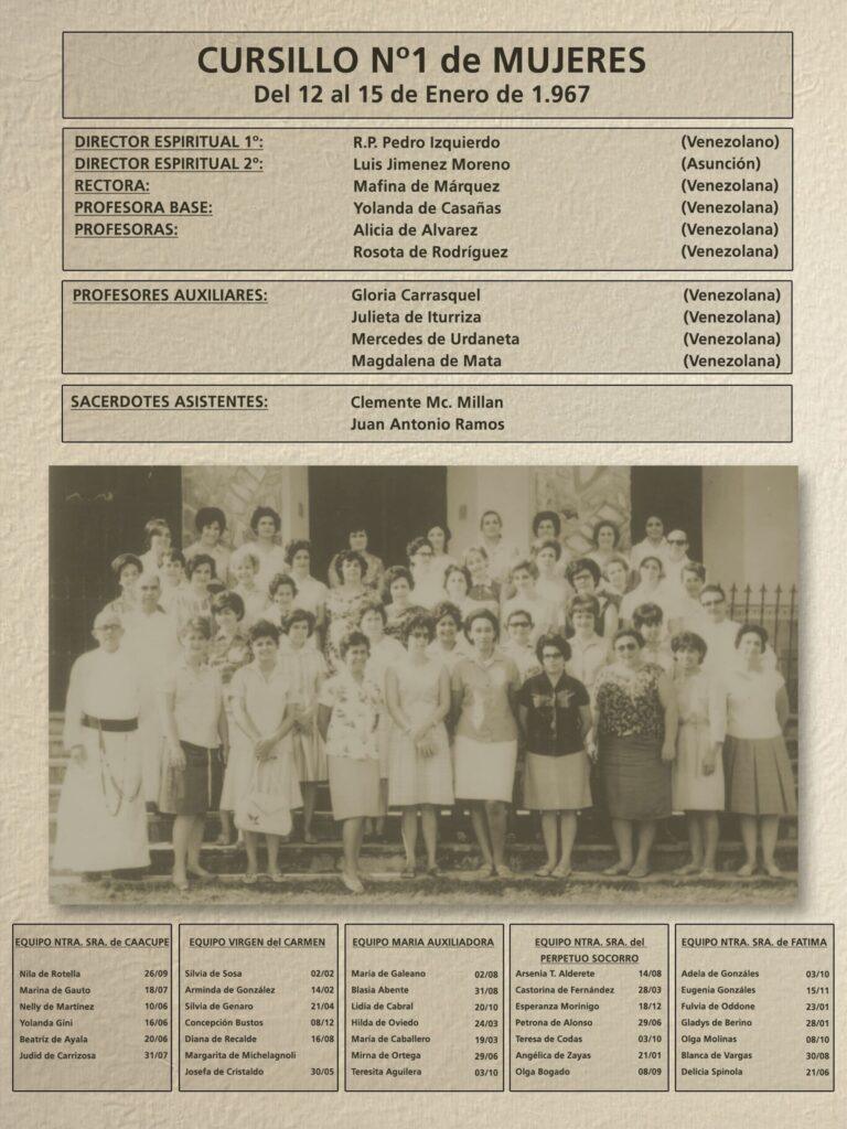 El éxito inmediato de este primer cursillo y del segundo, realizado la semana siguiente con el equipo reforzado por el Padre Clemente y los primeros auxiliares paraguayos, generó un fruto maravilloso: los hombres, transformados por la experiencia, sintieron el anhelo de compartir esta gracia con sus esposas. La comunidad cursillista respondió, y con la generosa ayuda de un equipo completo enviado desde Venezuela, se realizó el primer Cursillo de mujeres en enero de 1967. La semilla había germinado en ambos corazones, el de hombres y mujeres.