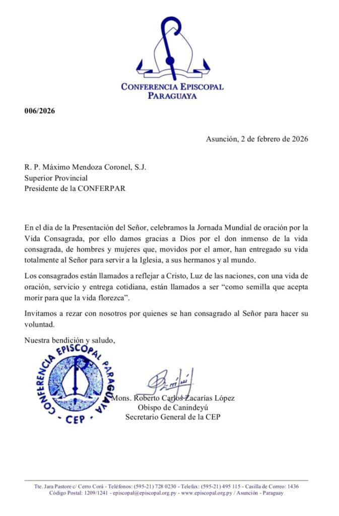 Con motivo de esta jornada, el Mons. Roberto Carlos Zacarías López, Obispo de Canindeyú y Secretario General de la Conferencia Episcopal Paraguaya (CEP), dirigió un mensaje en el que expresó su profunda gratitud por la vida consagrada, destacando el testimonio de entrega, oración y servicio que los consagrados ofrecen diariamente al Pueblo de Dios.