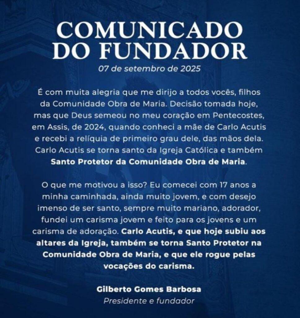 Con profundo júbilo, el presidente y fundador de la Comunidad “Obra de María”, Gilberto Gomes Barbosa, anunció el pasado 7 de septiembre de 2025 que San Carlo Acutis ha sido proclamado Santo Protector de la comunidad. La decisión, según sus propias palabras, fue el fruto de una inspiración divina sembrada en Pentecostés de 2024, durante una peregrinación en Asís. En ese momento, Gilberto tuvo un encuentro significativo con la madre de Carlo Acutis y recibió una reliquia de primer grado del joven servicio – símbolo que lo llevó a consagrarlo como protector espiritual de la misión.