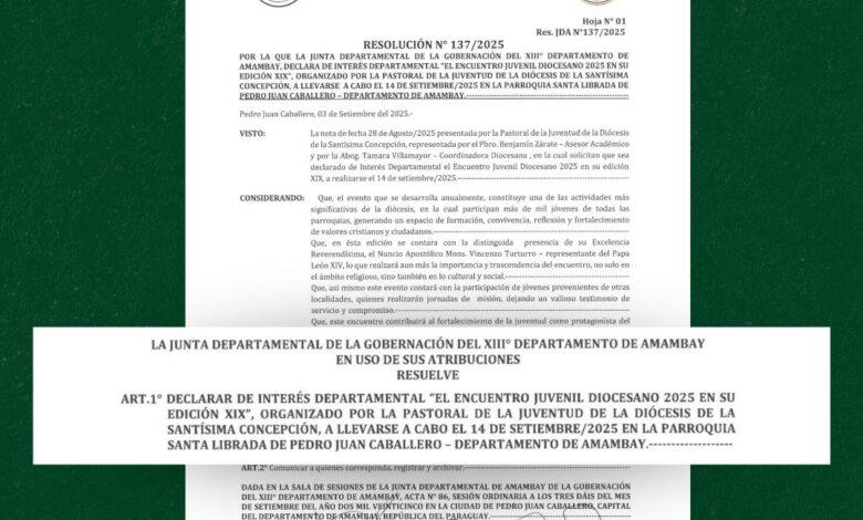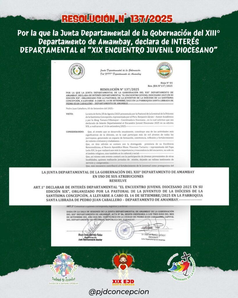 La Junta Departamental de la Gobernación del XIII Departamento de Amambay declaró de Interés Departamental el XIX Encuentro Juvenil Diocesano, organizado por la Pastoral de la Juventud de la Diócesis de la Santísima Concepción, que se realizará el domingo 14 de setiembre de 2025 en la Parroquia Santa Librada, de Pedro Juan Caballero.