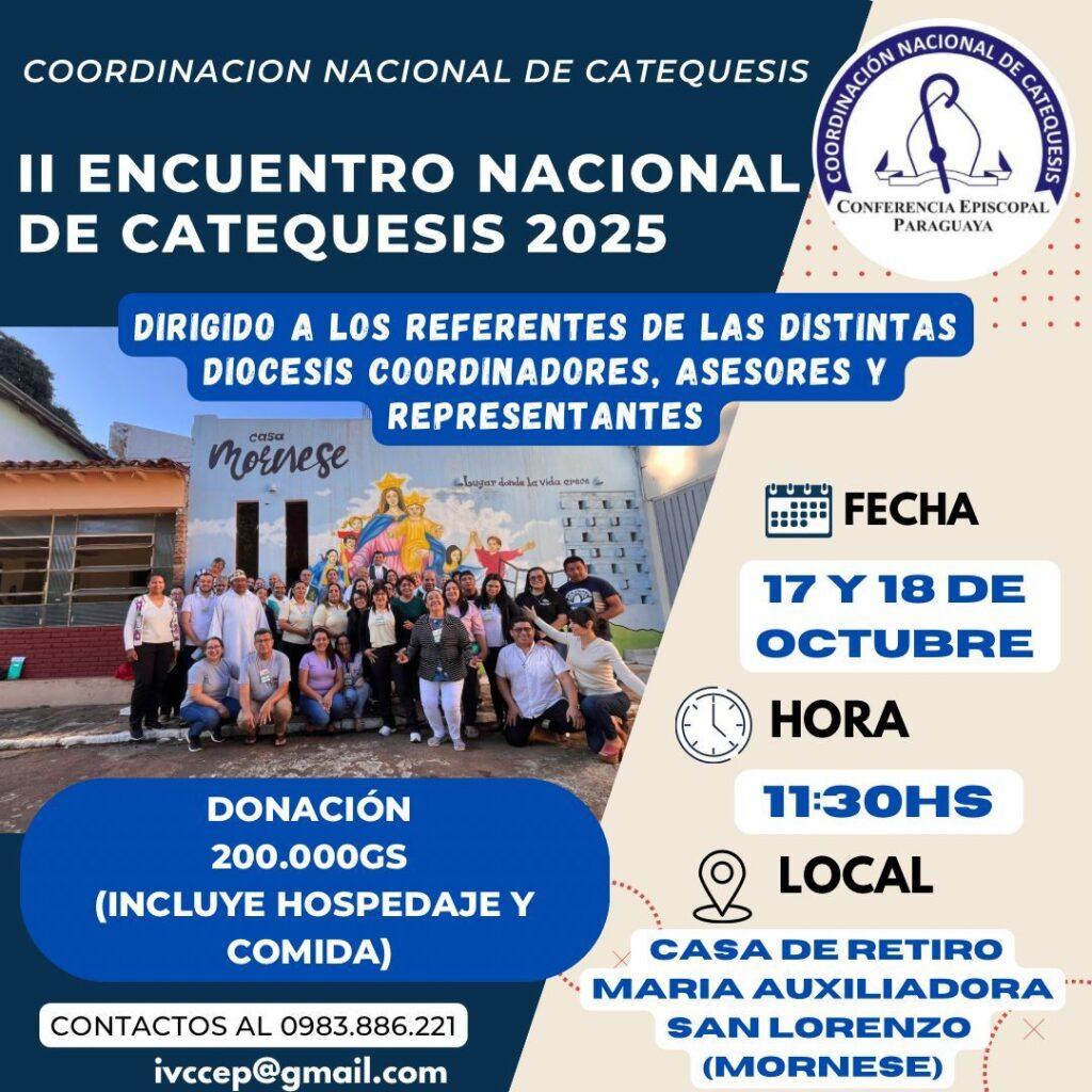 La Coordinación Nacional de Catequesis de la Conferencia Episcopal Paraguaya anunció la realización del II Encuentro Nacional de Catequesis, que se llevará a cabo los días 17 y 18 de octubre de 2025 en la Casa de Retiro María Auxiliadora (Mornese), en San Lorenzo.