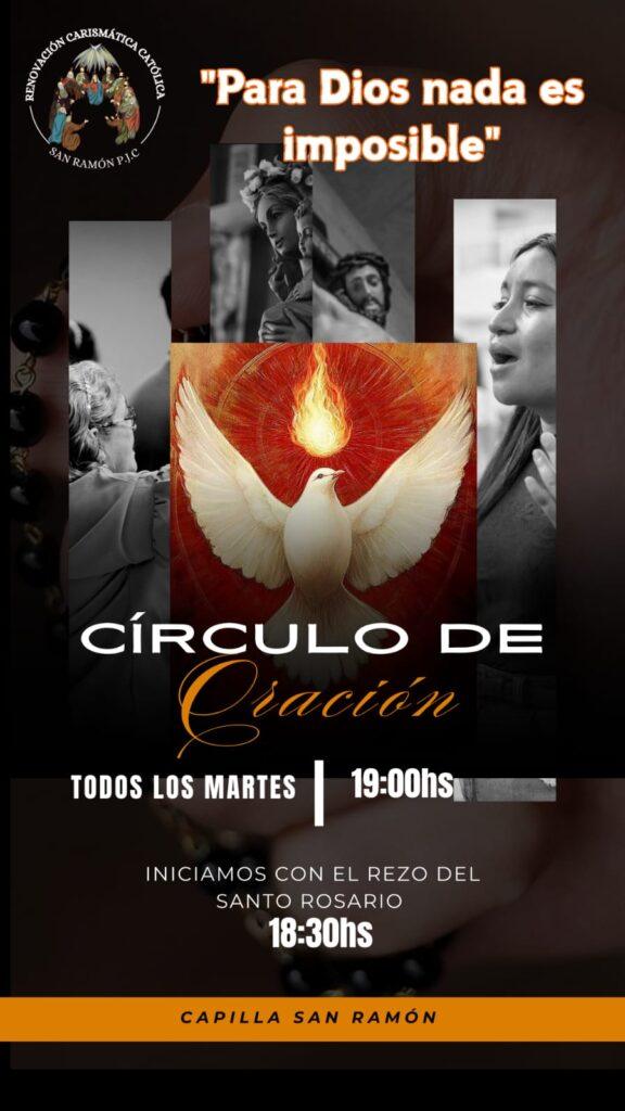 La Renovación Carismática Católica de San Ramón P.J.C. invita a participar del Círculo de Oración, un espacio de encuentro fraterno y de fortalecimiento espiritual que se lleva a cabo todos los martes en la Capilla San Ramón.
