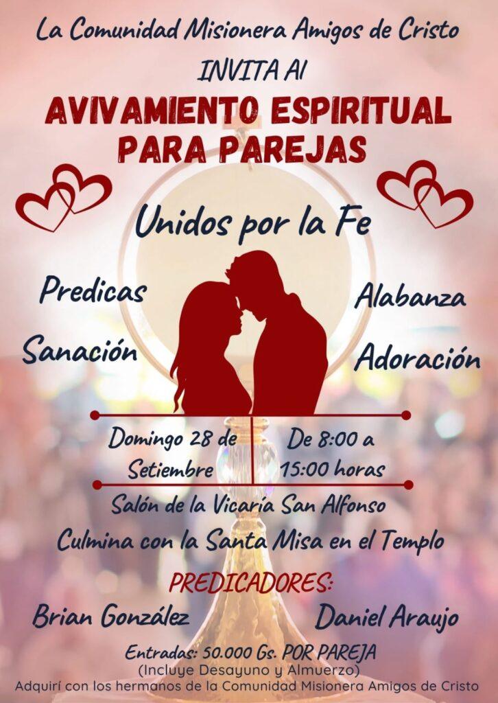La Comunidad Misionera Amigos de Cristo invita a todos los matrimonios y novios a participar del Avivamiento Espiritual para Parejas, bajo el lema “Unidos por la Fe”. El encuentro se realizará el próximo domingo 28 de septiembre, de 8:00 a 15:00 horas, en el salón de la Vicaría San Alfonso, y culminará con la Santa Misa en el templo.