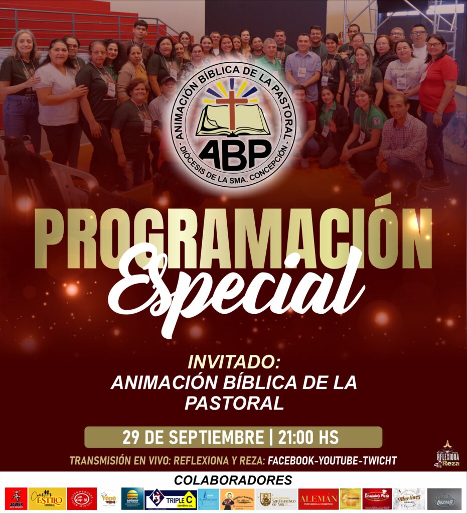 Esta noche, lunes 29 de septiembre, a las 21:00 horas, en nuestra programación especial Reflexiona y Reza, tendremos la alegría de recibir a la Animación Bíblica de la Pastoral (ABP) de la Diócesis de la Santísima Concepción, representada por su coordinador diocesano y los animadores bíblicos que trabajan con entrega en nuestras comunidades.