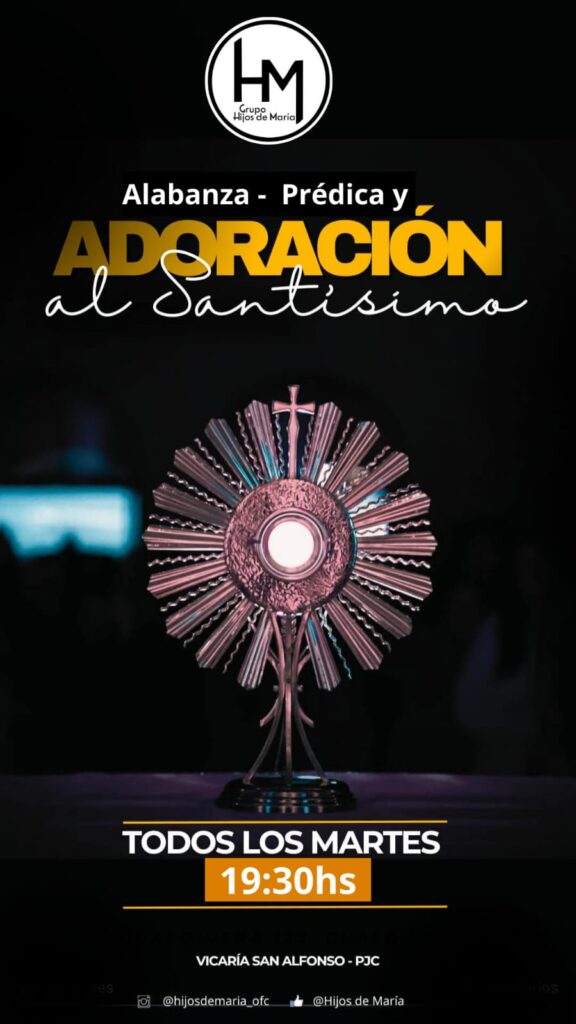 Cada martes, a las 19:30 horas, en la Vicaría San Alfonso – PJC, se lleva a cabo un encuentro de alabanza, prédica y adoración al Santísimo Sacramento, organizado por el Grupo Hijos de María.