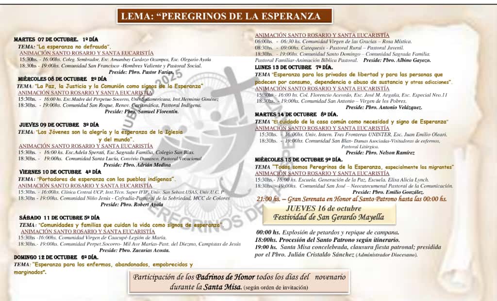 El programa inicia el martes 7 de octubre y se extenderá hasta el jueves 16 de octubre, día en que la Iglesia celebra la festividad del Santo Patrono. Cada jornada estará animada por distintas comunidades, colegios, movimientos y pastorales, abordando temas de esperanza que iluminan la vida cristiana en familia, en la sociedad y en la Iglesia.