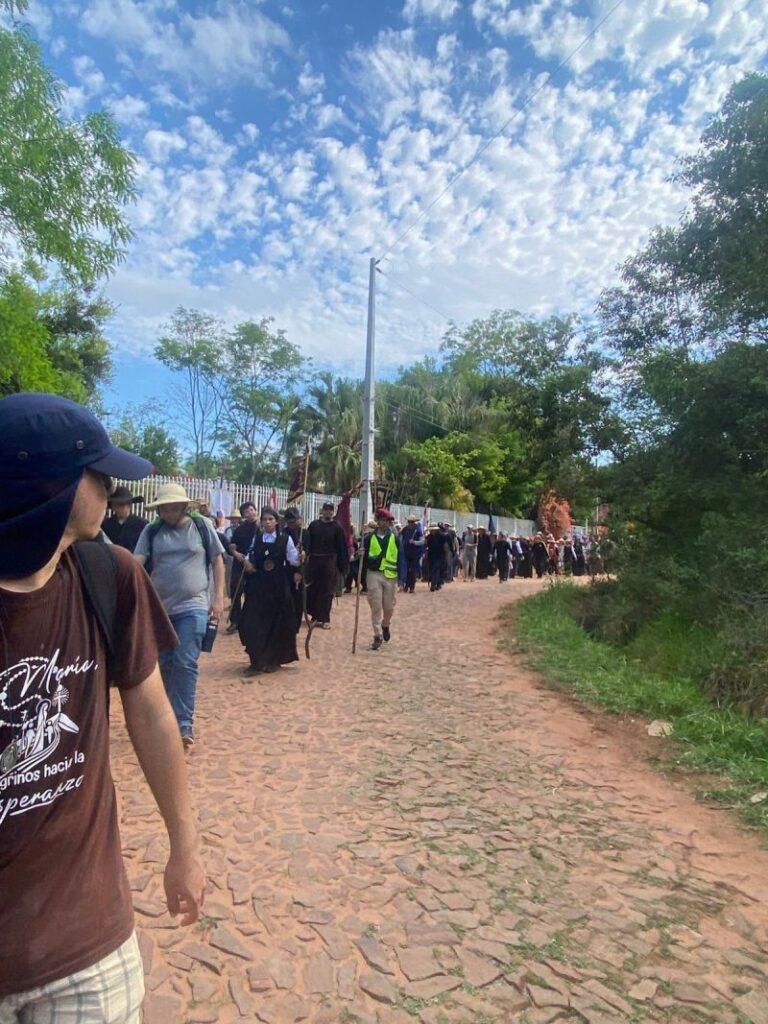 La jornada, organizada por una comisión de laicos de diversos grupos y centros culturales, y con la parroquia San Luis Gonzaga de la diócesis de Encarnación como patrocinadora principal, se vivió como un verdadero éxodo de fe. Desde la bendita ciudad de Ybycuí, situada a 119 kilómetros de Asunción, los peregrinos partieron con el corazón ardiente, como quien camina al encuentro del amor eterno. A lo lejos, los cerros vigilaban en silencio, mientras la arena de los caminos se mezclaba con las huellas firmes de los que, entre cantos y oraciones, levantaban estandartes y banderas que flameaban al viento. Más resplandecientes aún que esas telas eran los corazones que las sostenían, porque cada paso era un acto de entrega, y cada kilómetro, un testimonio de fe.