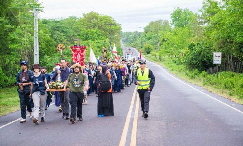 La jornada, organizada por una comisión de laicos de diversos grupos y centros culturales, y con la parroquia San Luis Gonzaga de la diócesis de Encarnación como patrocinadora principal, se vivió como un verdadero éxodo de fe. Desde la bendita ciudad de Ybycuí, situada a 119 kilómetros de Asunción, los peregrinos partieron con el corazón ardiente, como quien camina al encuentro del amor eterno. A lo lejos, los cerros vigilaban en silencio, mientras la arena de los caminos se mezclaba con las huellas firmes de los que, entre cantos y oraciones, levantaban estandartes y banderas que flameaban al viento. Más resplandecientes aún que esas telas eran los corazones que las sostenían, porque cada paso era un acto de entrega, y cada kilómetro, un testimonio de fe.
