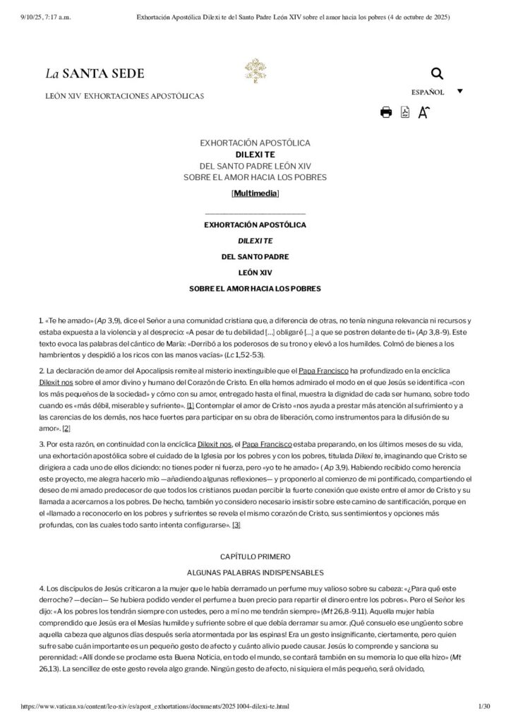 O Puedes leer el texto completo de la exhortación apostólica en el Sitio Oficial del Vaticano: Exhortación DILEXI TE