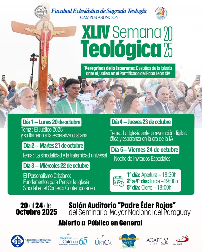 La Facultad Eclesiástica de Sagrada Teología – Campus Asunción anunció la realización de la XLIV Semana Teológica, uno de los encuentros académicos y pastorales más antiguos e importantes del país, que se llevará a cabo del 20 al 24 de octubre de 2025 en el Salón Auditorio “Padre Éder Rojas” del Seminario Mayor Nacional del Paraguay. El evento, abierto al público en general, convoca a estudiantes, docentes, religiosos y laicos interesados en profundizar en la fe y los desafíos actuales de la Iglesia.