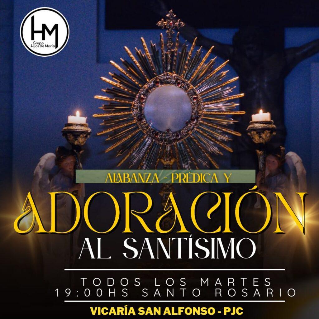 Este espacio de fe y recogimiento espiritual se desarrolla todos los martes, iniciando con el Santo Rosario, seguido de momentos de alabanza, reflexión bíblica y adoración al Santísimo Sacramento del altar.