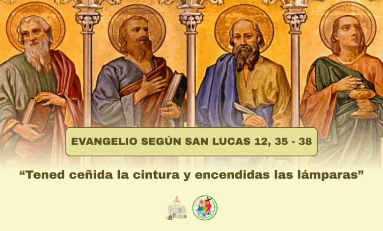 En aquel tiempo, dijo Jesús a sus discípulos: «Tened ceñida la cintura y encendidas las lámparas. Vosotros estad como los que aguardan a que su señor vuelva de la boda, para abrirle apenas venga y llame. Dichosos los criados a quienes el señor, al llegar, los encuentre en vela; os aseguro que se ceñirá, los hará sentar a la mesa y los irá sirviendo. Y, si llega entrada la noche o de madrugada y los encuentra así, dichosos ellos.»