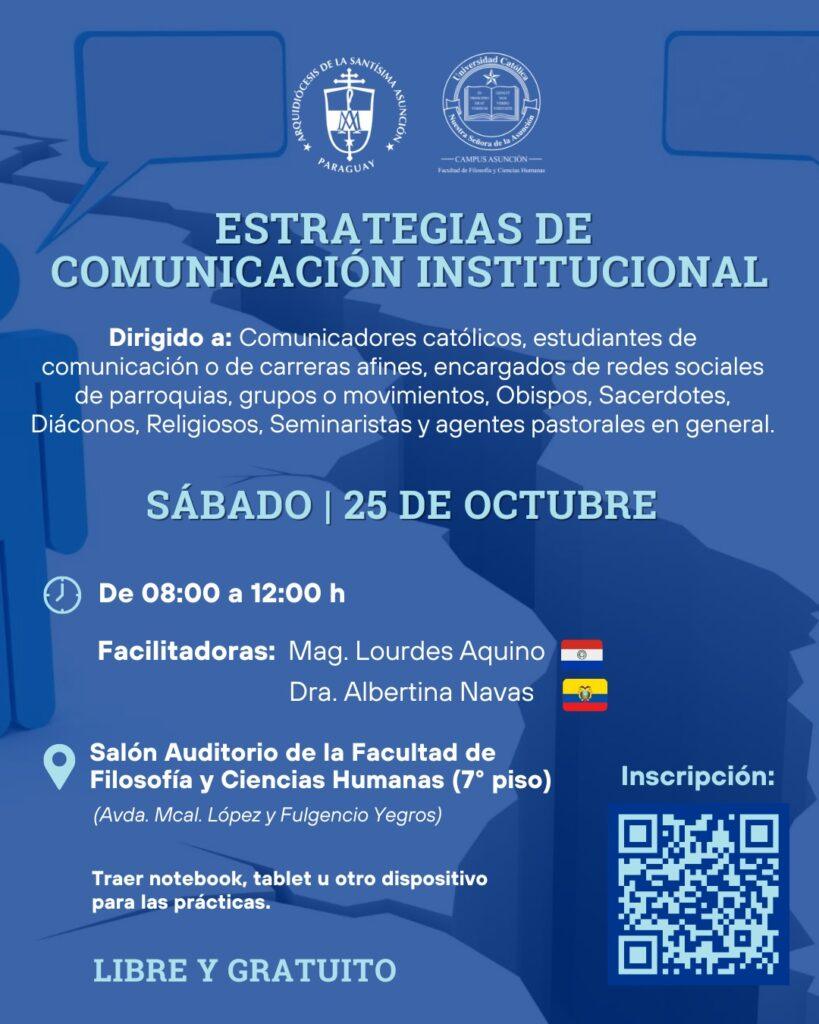 El Departamento de Comunicación de la Arquidiócesis de la Santísima Asunción, junto con la Facultad de Filosofía y Ciencias Humanas de la Universidad Católica “Nuestra Señora de la Asunción”, llevará a cabo el V Taller “Comunicar en la Iglesia”, que en esta edición tendrá como eje temático “Estrategias de Comunicación Institucional”.