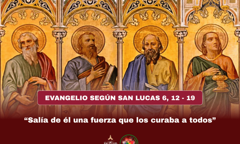 En aquel tiempo, subió Jesús a la montaña a orar, y pasó la noche orando a Dios. Cuando se hizo de día, llamó a sus discípulos, escogió a doce de ellos y los nombró apóstoles: Simón, al que puso de nombre Pedro, y Andrés, su hermano, Santiago, Juan, Felipe, Bartolomé, Mateo, Tomás, Santiago Alfeo, Simón, apodado el Celotes, Judas el de Santiago y Judas Iscariote, que fue el traidor. Bajó del monte con ellos y se paró en un llano, con un grupo grande de discípulos y de pueblo, procedente de toda Judea, de Jerusalén y de la costa de Tiro y de Sidón. Venían a oírlo y a que los curara de sus enfermedades; los atormentados por espíritus inmundos quedaban curados, y la gente trataba de tocarlo, porque salía de él una fuerza que los curaba a todos.