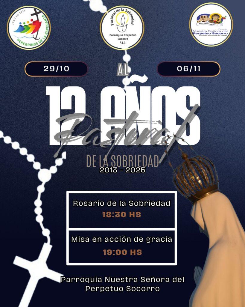 La Parroquia Nuestra Señora del Perpetuo Socorro invita a toda la comunidad a sumarse a esta semana de oración y gratitud, confiando a la Virgen María los frutos de este servicio eclesial. Del 29 de octubre al 6 de noviembre en la Parroquia Nuestra Señora del Perpetuo Socorro – P.J.C. , rosario de la Sobriedad: 18:30 h y Misa: 19:00 h.