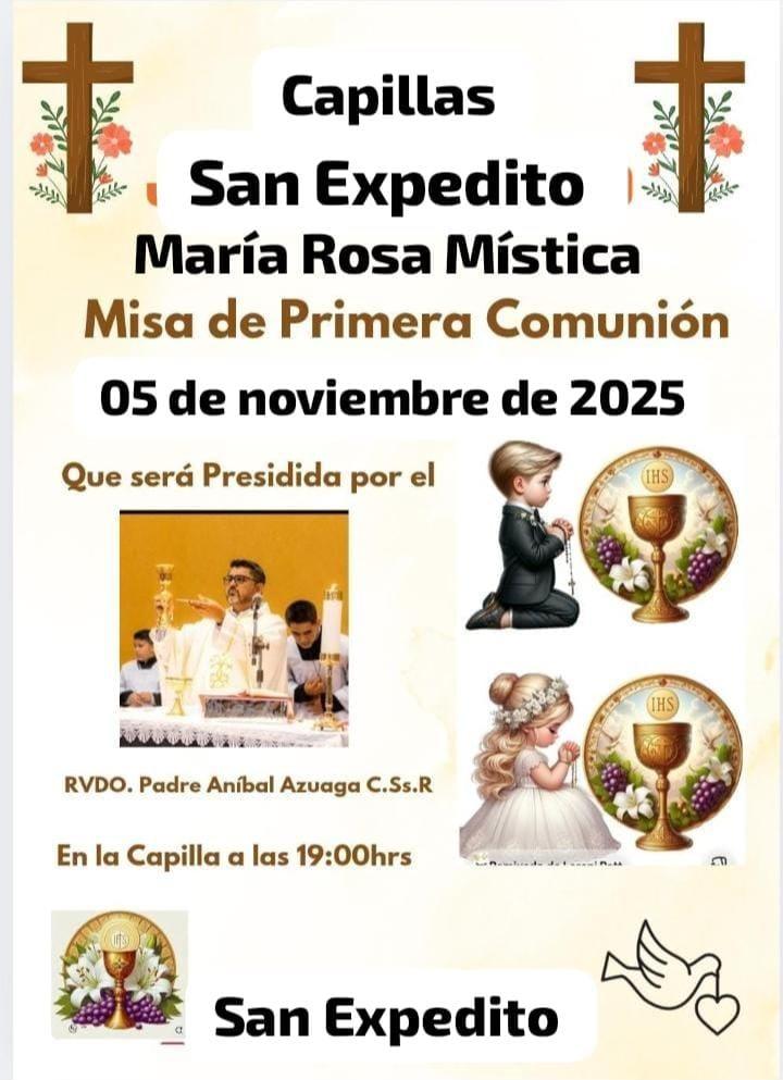Con alegría y espíritu de fe, las comunidades de las capillas San Expedito y María Rosa Mística pertenecientes a la Cuasi Parroquia San Francisco de Asís celebrarán la Misa de Primera Comunión el próximo miércoles 5 de noviembre de 2025, a las 19:00 horas, en la capilla local.