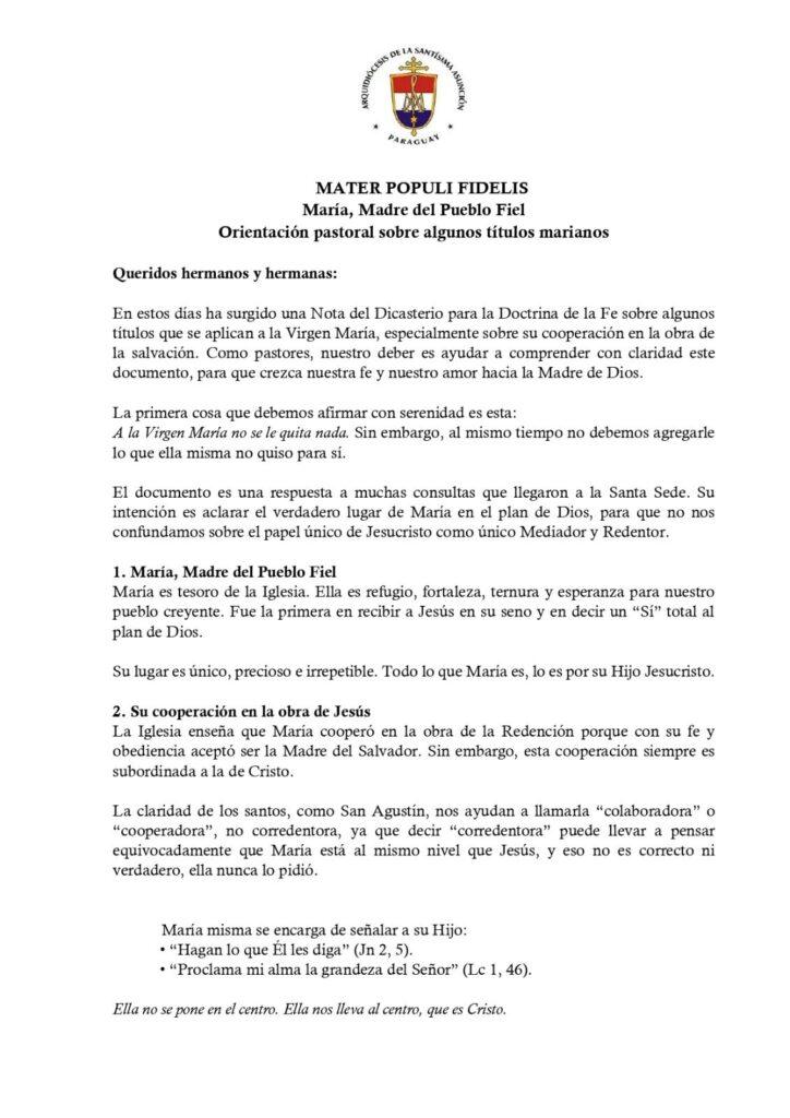 El documento, presentado bajo el título «Mater Populi Fidelis» (María, Madre del Pueblo Fiel), aborda específicamente la cooperación de María en la obra de la salvación. Con un tono sereno y pedagógico, las autoridades eclesiales explican que, si bien María es «tesoro de la Iglesia», «refugio y esperanza», su cooperación fue siempre «subordinada» a la de Cristo. Por este motivo, se prefiere usar los términos bíblicos y tradicionales de «colaboradora» o «cooperadora», evitando el de «corredentora» para no generar confusión y no colocarla «al mismo nivel que Jesús».