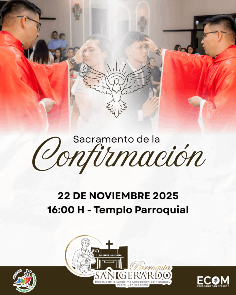 La Parroquia San Gerardo, de la Diócesis de la Santísima Concepción del Paraguay, invita a toda la comunidad a participar de la celebración del Sacramento de la Confirmación, que tendrá lugar el 22 de noviembre de 2025, a las 16:00 horas en el Templo Parroquial.