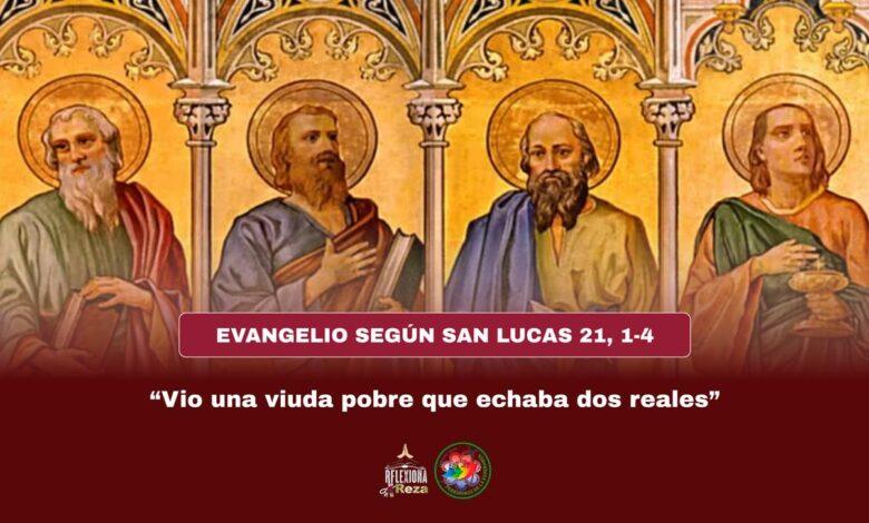 En aquel tiempo, Jesús, alzando los ojos, vio a unos ricos que echaban donativos en el tesoro del templo; vio también una viuda pobre que echaba dos monedillas, y dijo: