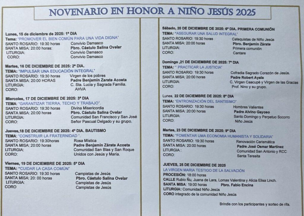 La Comunidad Niño Jesús de la Jurisdicción de la Parroquia San Gerardo invita a todos los fieles a participar del Novenario en honor al Niño Jesús 2025, un tiempo de oración, encuentro y compromiso cristiano que nos prepara para celebrar el misterio de la Navidad.
