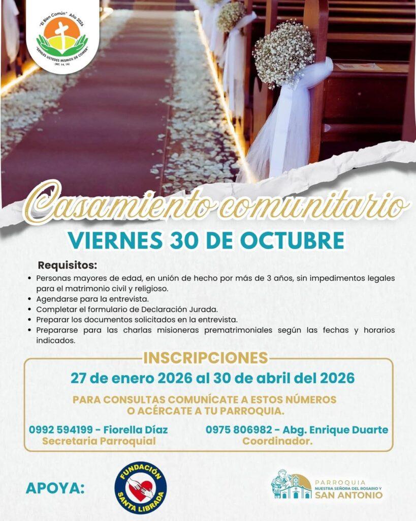 La Parroquia Nuestra Señora del Rosario y San Antonio, con el apoyo de la Fundación Santa Librada, anuncia la realización de un Casamiento Comunitario, que se llevará a cabo el viernes 30 de octubre, como una oportunidad pastoral para que numerosas parejas puedan regularizar su situación matrimonial ante la Iglesia y la sociedad.
