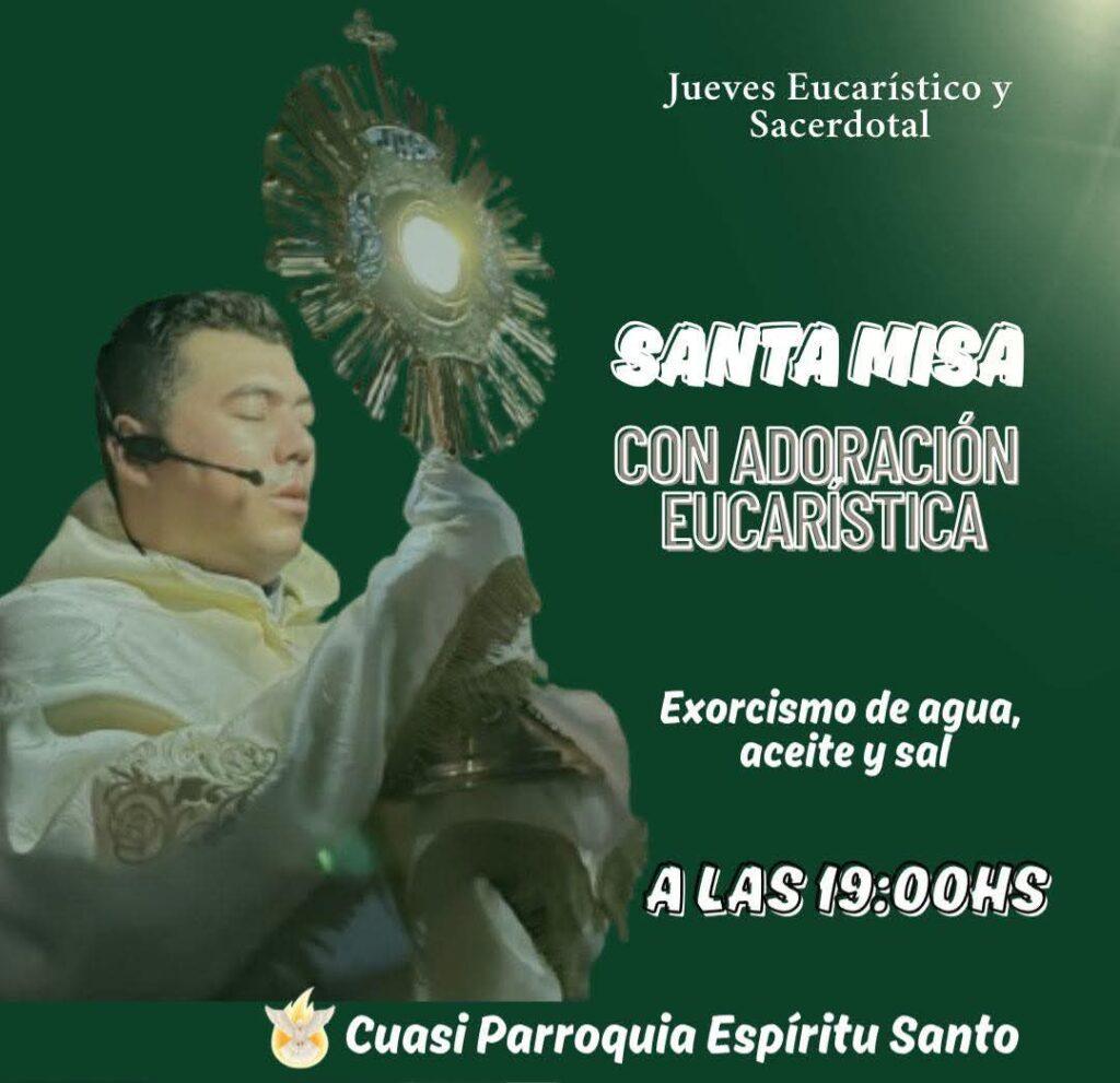 La Cuasi Parroquia Espíritu Santo invita a la Santa Misa con Adoración Eucarística a las 19:00 h , también habrá exorcismo de agua, aceite y sal.