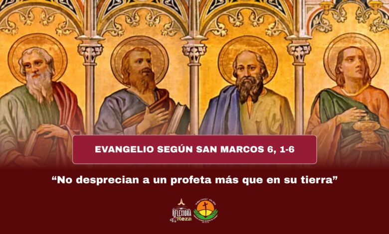 > En aquel tiempo, Jesús fue a su tierra en compañía de sus discípulos. Cuando llegó el sábado, empezó a enseñar en la sinagoga; la multitud que lo oía se preguntaba asombrada: «¿De dónde saca todo eso? ¿Qué sabiduría es esa que le han enseñado? ¿Y esos milagros de sus manos? ¿No es este el carpintero, el hijo de María, hermano de Santiago y José y Judas y Simón? ¿Y sus hermanas no viven con nosotros aquí?».