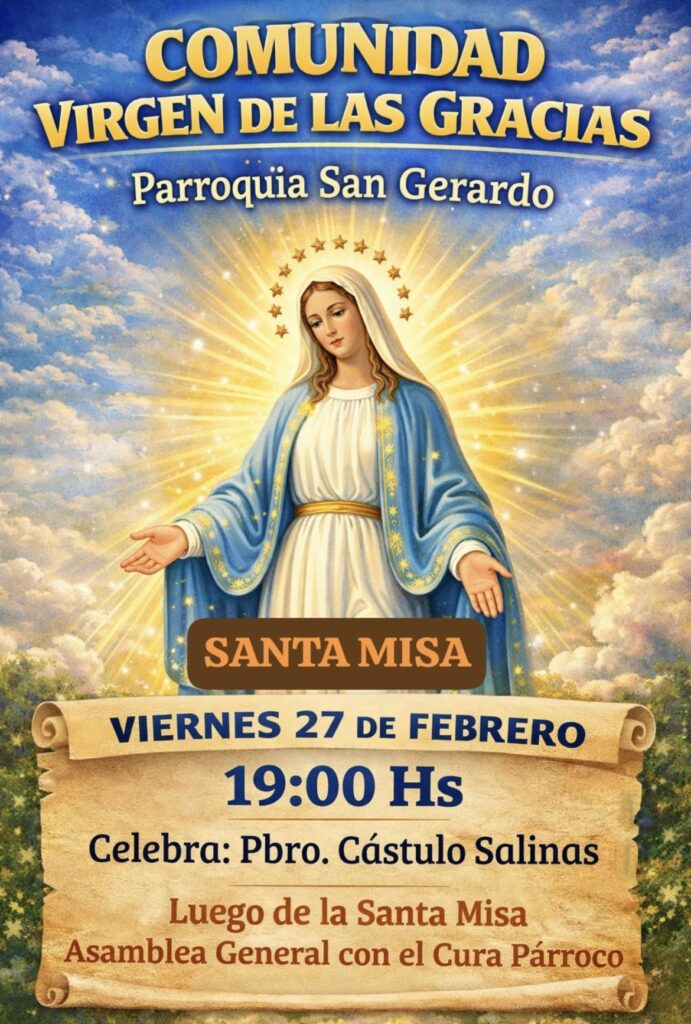 La comunidad Comunidad Virgen de las Gracias, perteneciente a la Parroquia San Gerardo, invita a los fieles a participar de la celebración de la Santa Misa que se realizará el viernes 27 de febrero a las 19:00 horas.