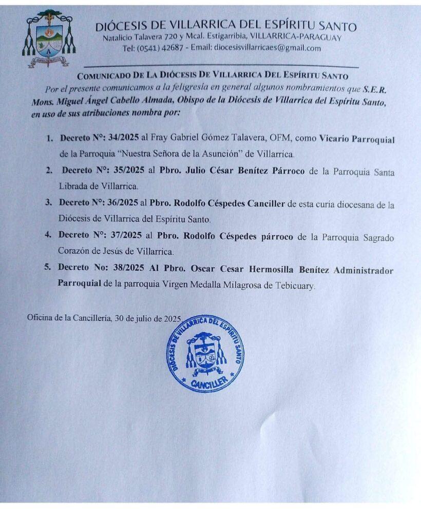 Villarrica, 30 de julio de 2025 – La Diócesis de Villarrica del Espíritu Santo ha dado a conocer oficialmente una serie de nuevos nombramientos pastorales, conforme a los decretos emitidos por su obispo, S.E.R. Mons. Miguel Ángel Cabello Almada, en ejercicio de sus atribuciones episcopales.