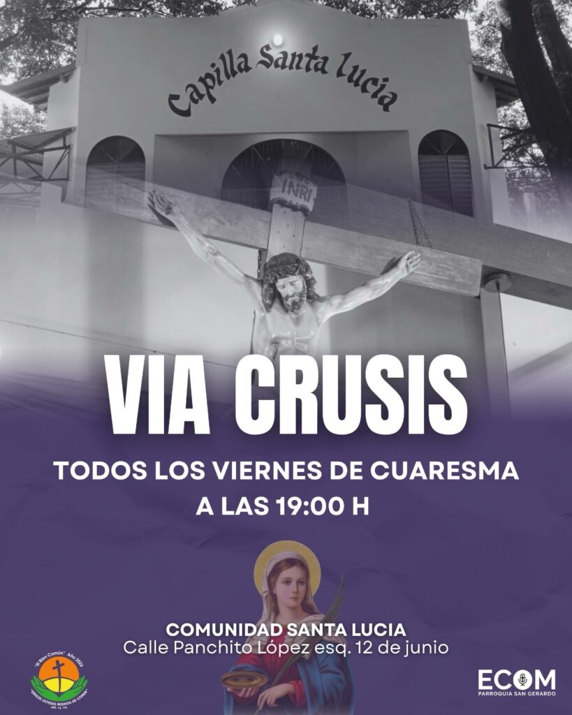 La Comunidad Santa Lucía de la Parroquia San Gerardo invita a participar del rezo del Vía Crucis, una tradición propia del tiempo de Cuaresma, en la que los fieles contemplan y meditan la pasión y muerte de Jesucristo.