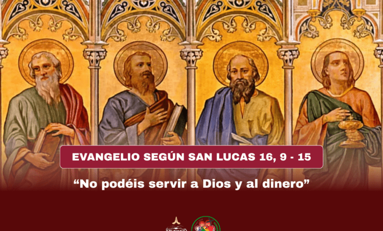 En aquel tiempo, Jesús dijo a sus discípulos: «Ganaos amigos con el dinero injusto, para que cuando os falte, os reciban en las moradas eternas. El que es de fiar en lo menudo, también en lo importante es de fiar; el que no es honrado en lo menudo, tampoco en lo importante es honrado. Si no fuisteis de fiar en el vil dinero, ¿quién os confiará lo que vale de veras? Si no fuisteis de fiar en lo ajeno, ¿lo vuestro quién os lo dará? Ningún siervo puede servir a dos amos: porque o bien aborrecerá a uno y amará al otro, o bien se dedicará al primero y no hará caso del segundo. No podéis servir a Dios y al dinero».