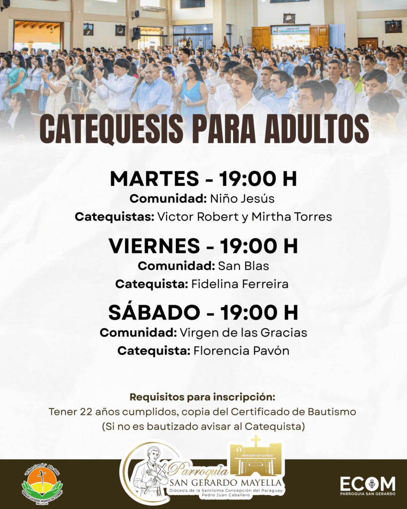 Se invita a los adultos a participar del proceso de catequesis en sus distintas comunidades, ofreciendo espacios de formación en la fe y preparación para los sacramentos.