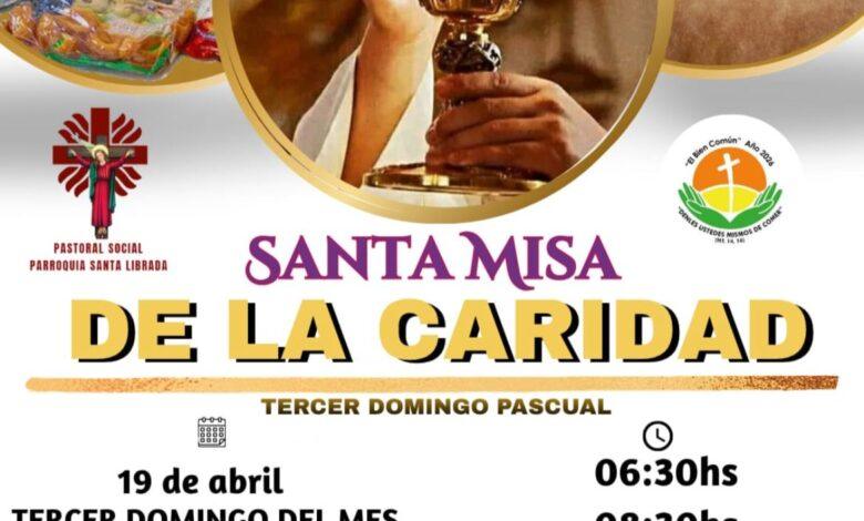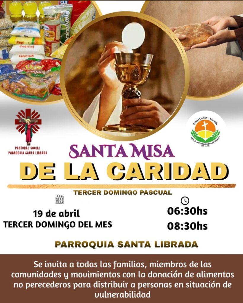 La Pastoral Social de la Parroquia Santa Librada invita a toda la comunidad a participar de la Santa Misa de la Caridad, que se celebrará el domingo 19 de abril, en el marco del tercer domingo pascual y también tercer domingo del mes.