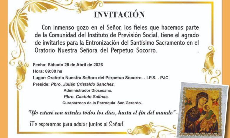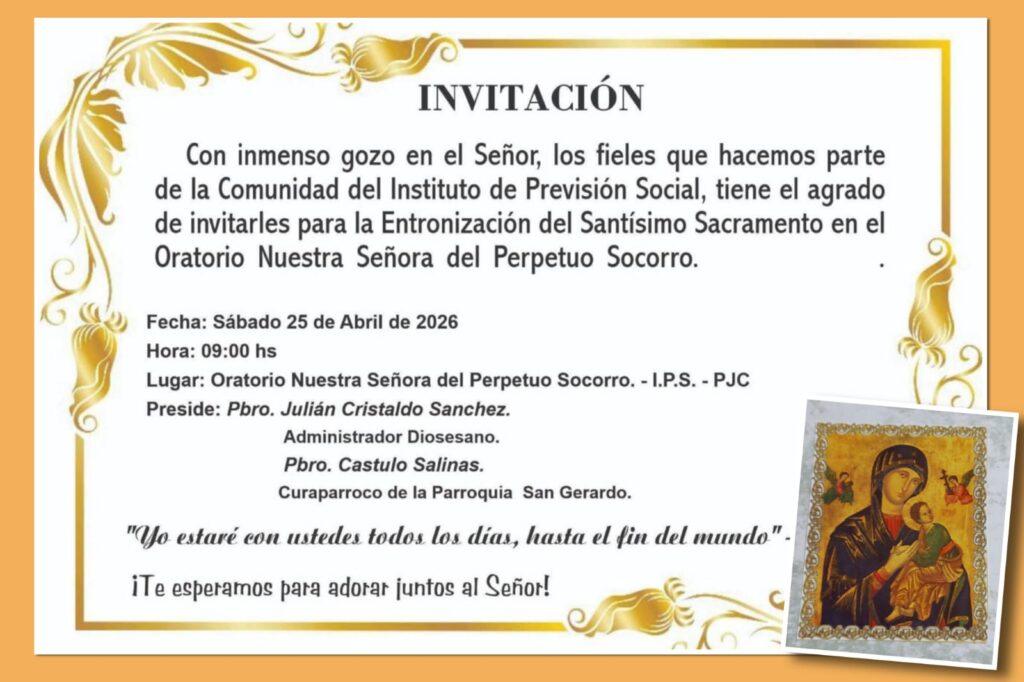 La comunidad del Instituto de Previsión Social invita a los fieles a participar de la entronización del Santísimo Sacramento en el Oratorio Nuestra Señora del Perpetuo Socorro.