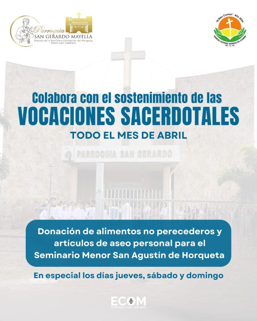 La Pastoral Vocacional de la Parroquia San Gerardo invita a toda la comunidad a sumarse a la campaña solidaria en favor de las vocaciones sacerdotales, que se desarrollará durante todo el mes de abril.